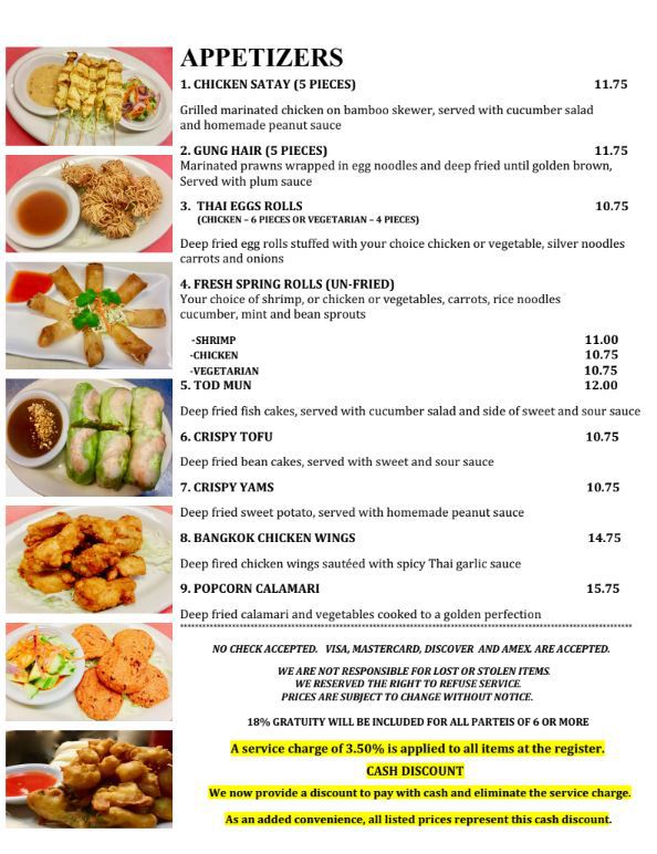 We reserve the right to refuse service for any reason. We are NOT responsible for lost articles. A 20% gratuity will be charged for all parties over six. No checks accepted. We accept cash, Visa and/or MasterCard.